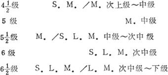 7级及以下 L.M.and Lower 下级及以下 淡点污棉: 4级 S.M. 次上级 5级 M. 中级 6~7级 S.L.MandL. M次中级和下级 希腊棉花长度以毫米为单位,分25、26、27、28、29、30共6个档次(相当于
