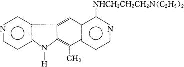 C22H27N5=361.49 CAS-65222-35-7 10-[[3-(二乙氨基)丙基]氨基]-6-甲基-5H-吡啶并[3′,4′∶4,5]-吡咯并[2,3-g]异喹啉。 10-[[3-(Diethylamino)propyl]amino]-6-methyl-5Hpyrido[3′,4′∶4,5]pyrrolo[2,3-g]isoquinoline. N,N-二乙基-N′-(6-甲基-5H-吡啶并[3′,4′∶4,5]-吡咯并[2,3-g]异喹啉-10-基)-1,3-丙烷二胺。 N,N-Diethyl-N′-(6-methyl-5H-pyrido[3′,4′∶4,5]pyrrolo[2,3-g]isoquinolin-10-y1)-1,3-propanediamine, 抗肿瘤药。 泊泽尼普定。 Pazelliptine,BD 40,NSC 327471D. INN,USAN.  |