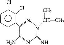 C12H13Cl2N5=298.17 CAS-98410-36-7 5-氨基-6-(2,3-二氯苯基)-2,3-二氢-3-亚氨基-2-异丙基-不均-三嗪。 5-Amino-6-(2,3-dichlorophenyl)-2,3-dihydro-3-imino-2-isopropyl-as-triazine. 6-(2,3-二氯苯基)-2,5-二氢-5-亚氨基-2-(1-甲基乙基)-1,2,4-三嗪-3-胺。 6-(2,3-Dichlorophenyl)-2,5-dihydro-5-imino-2-(1-methylethyl)-1,2,4-triazin-3-amine. 消炎镇痛药,抗心律失常药。 帕耐曲经。 Palatrigine,BW A256C. INN,BAN,USAN.  |