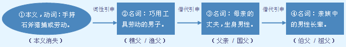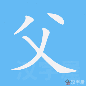 字源解说 “父”是“斧”的本字。父,甲骨文 在“又” 字上加一竖指事符号 ,代表手上持握的石斧或石凿之类的工具。造字本义:手持石斧,猎捕或劳动。金文 画出尖锐的石斧形状 。篆文 承续金文字形。隶书 将篆文的“又” 写成 ,字形变化较大。当“父”的“持斧”本义消失后,再加“斤”另造“斧”代替。远古时代利用工具进行体力劳动,对开创生活具有重大意义,受到特别尊重,因此“父”是古人对从事劳动的男子的尊称。 附 文言版《説文解字》:父,矩也。家長率教者。从又舉杖。 附 白话版《说文解字》:父,是规矩的代表,是一家之长,是带领、教育子女的人。字形采用“又”作边旁,像一手举杖教训子女的样子。 引申线索