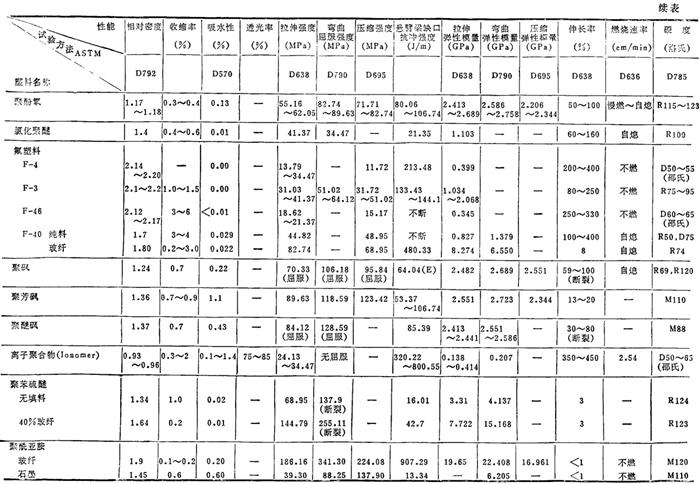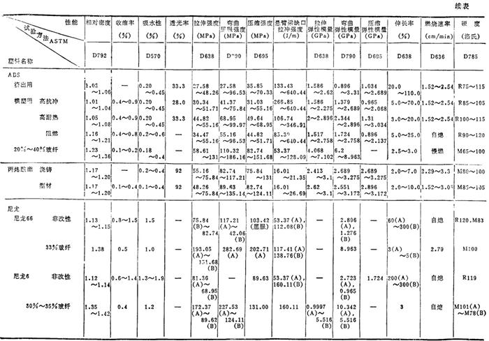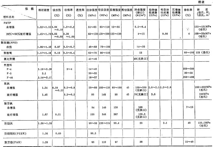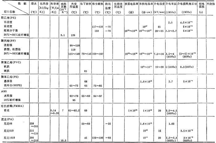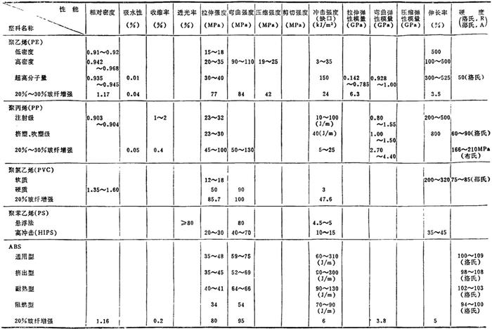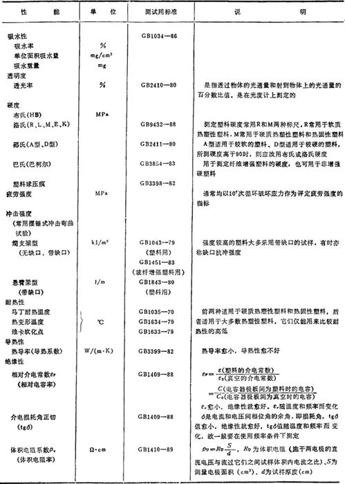 | 释义 | 常用塑料各种性能简介 1.3.1 常用塑料的各种性能 常用塑料的物理、力学及热、电性能见表2.2-4、2.2-5;国产主要塑料的物理、力学及热、电性能见表2.2-6、2.2-7。 表2.2-4 常用塑料的物理、力学性能