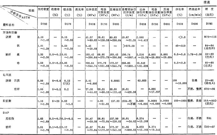 注: ❷ (A)为干燥料成型(含水量0.2%),(B)为相对湿度50%下调质处理过。 ❸ 表中数据均为由英制换算得到。 ❹ 各性能的含义见表2.2-9。 表2.2-5 常用塑料的物理(热、电)性能