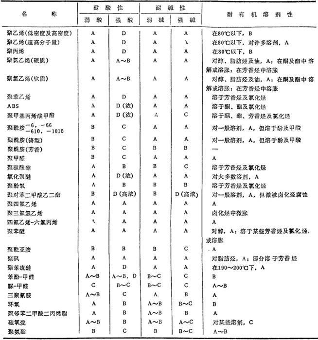 注:各性能的含义见表2.2-9。 表2.2-8 各种塑料的耐化学性能