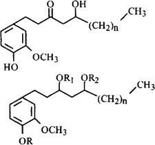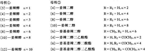 | 释义 | 干姜 【名称出处】:《别录》 【概况】: 异名 白姜、均姜、干生姜(《纲目》)。 基源 为姜科姜属植物姜的干燥根茎。 原植物 姜Zingiber officinale Rosc. 余项参见“生姜”条。。【生药】: 采集 冬季茎叶枯萎时挖取根茎,去净茎叶、须根、泥沙,晒干或微火烘干。 药材主产于四川、山东、湖北、江苏、广东,陕西亦产。以四川、贵州的产量大,品质较好。 鉴别 性状 根茎呈不规则的块状,略扁,具指状分枝,长3~7cm,厚1~2cm,表面灰棕色或浅黄棕色,粗糙,具纵皱纹及明显的环节,分枝处常有鳞叶残存,分枝顶端有茎痕或芽。质坚实,断面黄白色或白色,显粉性和颗粒性,内皮层环纹明显,维管束散在,可见黄色油点。气香特异,味辛、辣。以质坚实、断面色黄白、粉性足、气味浓者为佳。 显微 根茎(直径1.5cm)横切面:木栓层为多列扁平木栓细胞。皮层中散列多数叶迹维管束;油细胞随处可见;内皮层明显,可见凯氏带。 中柱占根茎的大部分,散列多数外韧型维管束,近中柱鞘处维管束形小,排列较紧密,木质部内侧或周围有非木化的纤维束,并散有油细胞。本品薄壁组织含淀粉粒。(图见《中药志》.第2册.第2版.图181) 粉末淡黄棕色,有特异香气,味辛、辣。 ❶ 淀粉粒众多呈卵圆形、椭圆形、三角状卵形、类圆形或不规则形,直径5~40μm,脐点点状,位于较小端,也有裂缝状者,层纹有的明显。 ❷ 油细胞及树脂细胞散于薄壁组织中,内含淡黄色油滴或暗红棕色物质。 理化 ❶ 干姜与生姜的薄层色谱 取样品适量,磨碎,加甲醇适量,振摇后,静置1小时,滤过,滤液浓缩至约1ml.点于硅胶G板上,以石油醚-乙酸乙酯(17.3)为展开剂,以芳樟醇,1、8-桉油素为对照,展距10cm,用1%香草醛硫酸染显色(图见《中药材薄层色谱鉴别》.图1821)。 ❷ 干姜与生姜的薄层色谱 1)挥发油类成分的薄层色谱 取样品适量,用水蒸汽蒸馏提取挥发油,点于硅胶G板上,以正已烷-乙酸乙酯(17 3)为展开剂,姜炭、炮姜、干姜,展开后,用香草醛浓硫酸试剂显色(图见《中药材薄层色谱鉴别》.图182-2A)。 2)糖类成分的薄层色谱 取样品粉末适量,以水蒸气蒸馏提取蒸馏液,点于硅胶G板上以氯仿-甲醇(9∶1)为展开剂,展开后,用茴香醛硫酸试剂显色(图见《中药材薄层色谱鉴别》.图182-2B)。 ❸ 生姜的薄层色谱 取样品适量,用水蒸汽蒸馏提取挥发油,点于硅胶G板上,以正己烷-苯-乙酸乙酯(70∶15∶15)为展开剂,展开后,用茴香醛-浓硫酸-磷钼酸(1.1∶1)喷雾于110℃加热5分钟显色(图见《中药材薄层色谱鉴别》.图182-3)。 加工炮制 常用炮制品有干姜片、炮姜和姜炭。 ❶ 干姜片 取原药材,除去杂质,略泡,洗净,润透、切厚片或块,干燥。 ❸ 姜炭 取干姜块,置锅内,用武火加热,炒至表面焦黑色,内部棕褐色时,喷淋清水少许,灭尽火星,取出凉透。此外,尚有土制、麸制、蜜制、盐制等炮制方法。 贮藏 置阴凉干燥处,防蛀。。【化学】: 干根茎含挥发油2%~3.5%,油中主成分为姜萜酮(Zingiberone),其次为β-没药烯(β-Bisabolene),α-姜黄烯(α-Curcumene),β-倍半水芹烯(β-Sesquiphellandrene),姜醇(Zingiberol),d-莰烯(d-Camphene),桉油精(Eucalyptole),枸橼醛(Citral),龙脑(Borneol)等[1,2]。 根茎还含有辛辣的姜辣醇(Gingerols)类成分:[3,4]
