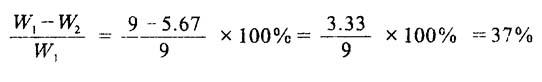 式中 W1、W2——干燥前后每kg干燥物料的含水率(kg水/kg物料) W——总蒸发量(kg/kg物料) G——物料总重量(kg/kg物料) G0——绝干物料重量(kg/kg物料) α1、α2——干燥前后每kg湿润物料的水分(%) [例]假设物料的初始水分α1=0.9,则: ❶ 干燥1kg物料需除去多少水分; ❷ 若要把初始水分α1=0.85,初始含水率ω1=5.67的物料干燥到绝干程度,则干燥1kg物料少除去多少水分?少蒸发多少kg水?对初始水分来说,可以节省多少干燥量。  即干燥1kg物料就需除去9kg水分。 ❷ 干燥lkg物料则少除去的水分为: α1-α2=0.9-0.85=0.5 少蒸发水分为: W1-W2=9-5.67=3.33(kg水/kg物料) 对初始水分来说,可节省干燥量:  |