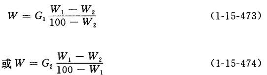【说明】 根据工艺方面的要求,纸幅在离开压榨部时的水分含量一般在63~67%左右。就是说进入干燥部每1kg湿纸幅中含有0.63~0.67kg的水分和0.33~0.37kg的干纸。这是以湿纸为基准(简称湿基)表示纸页中水分含量的方法,用W表示;另外还有一种以绝干纸为基准(简称干基)表示水分含量的方法,以C表示。在干燥过程中被蒸发的水分重量可由下式求得。 【公式】  式中 W——被蒸发的水分重量(kg/h) G1——进入干燥部的湿纸重量(kg/h) G2——出干燥部的湿纸重量(kg/h)  W1——干燥前纸中的水分含量,即湿基(%)  W水——干燥前纸页中水分重量(kg/h) W纸——干燥前纸页中绝干纸重(kg/h) W2——干燥后纸中的水分含量,即湿基(%),计算同W |