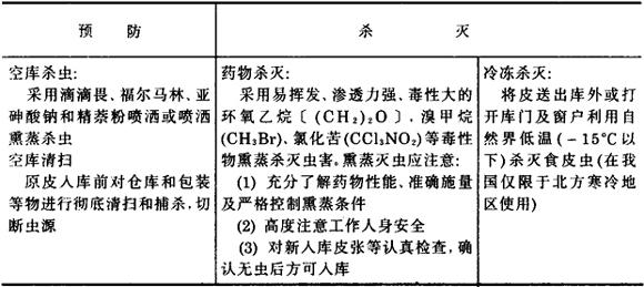 | 释义 | 干皮的防虫 原皮仓库常见的食皮虫有蛸翅类(甲虫),鳞翅类(蛾类)和双翅类。其中甲虫主要有三种,即普通食脂皮虫,弗里什皮虫和腐肉皮虫见图1-35。 干皮的防虫分成预防和杀灭,见表1-80。 表1-80 干皮的防虫