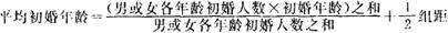 又分两种情况:一种是某一年内初婚者的平均年龄,称为某年的平均初婚年龄;一种是一批同年出生者初婚时的平均年龄,称为出生同批人的平均初婚年龄。男子的初婚年龄一般大于女子的初婚年龄,因此男女应分别计算。其计算公式是: