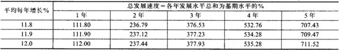某工厂5年总产值发展水平之和为基期水平的710%,查上表在表中5年的倒数第2行709.47接近710%,故平均增长速度为该行第一栏的11.9%,平均发展速度为100%+11.9%=111.9% |