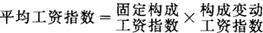 式中:Wa为平均工资指数;Xi1、Xi0分别为报告期、基期某类职工工资总额;Ti1、Ti0分别为报告期、基期某类职工平均人数; 由于平均工资指数受企业各类职工工资水平和具有不同工资水平的职工构成两个因素的影响,应分别计算固定结构工资指数和构成变动工资指数。这三个指数的关系是:
