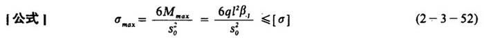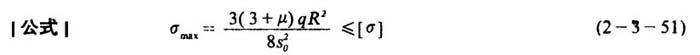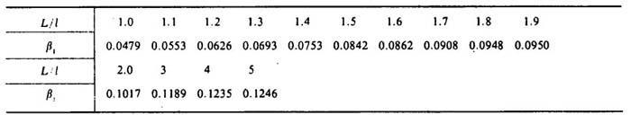 1.无角钢加强时 ❶ 平盖厚度计算  式中 5——厚度(m) k——结构系数,取0.4 p——均布载荷,取160Pa(包括平盖自重、器内微量负压、保温材料、雪载荷及工人体重) [σ]——弯曲应力(Pa) 其它同上 ❷ 平盖应力计算 [说明]如平盖厚度取和筒体壁厚一致,则平盖应力按下式验算。  式中 σma-—应力(Pa) μ——泊桑系数,取0.3 q——均布载荷,取160Pa R——平盖半径(m) s0——平盖计算厚度(不包括壁厚附加量)(m) 2.有角钢加强时 [说明]当容器公称直径Dg≥1800mm时,应考虑顶盖的加强。一般加两根角钢来加强顶盖。当Dg=1900mm时,顶盖上须加50×50×5角钢二根,角钢间距离l为600mm。当Dg=2000mm时,须加63×63×6角钢二根,其距离l为700mm。Dg=2200mm时,须加63×63×6角钢二根,其距离l为750mm。 ❶ 顶板最大应力(即顶板强度)校核计算  式中 Mmax单位宽度所承受的力矩(N·m/m) l——角钢间距(m) β1——系数,根据 值,由表2-3-11查出 表2-3-11 系数β1值  L——角钢计算长度(m)  [σ]——200℃下的许用应力(Pa),对A3F、A3、A3R钢为1233×104Pa s0——顶盖计算厚度(m)  s——顶盖厚度(m) c——附加厚度(m),见式2-3-9 ❷ 角钢最大应力校核计算   |