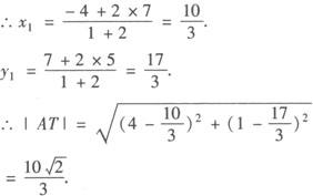 | 释义 | 平移公式 若点P(x,y)按向量a=(h,k)平移后得到P′(x′,y′),则 例1 △ABC中,A(4,1),B(7,5),C(—4,7),求∠A平分线的长. 解 设∠A的平分线交BC于T(x1,y1)由内角平分线定理知