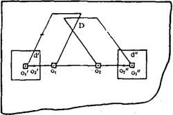 一种与辐射交会法基本一样的转绘方法。 二者差别在于平行尺法不用透明纸作传递辐射角的介质,而是通过特制的平行尺作为介质。因而其适用范围与辐射交会法相同。其作业步骤为:(1)在地形图上刺出相邻两张航片的辐射中心o1和o2,连接o1o2并向两侧延长。置航片于两侧,且航片上辐射中心点连线与o1o2延长线重合;(2)置平行尺于地形图上,使各平行尺的底图中心点针孔中心对准地形图上的辐射中心o1、o2。 同时平行尺基线尺中心的基线与o1o2延长线重合;(3)调整航片位置,使航片辐射中心准确地对准平行尺上航片中心点针孔中心;(4)用针固定各中心点(即固定基线尺)。扭动平行尺的其他部分,使航片交会尺中心的线条与待转绘点的辐射线重合(上图中的o′1d′及o″2d″)。此刻交会尺外侧边缘相交于一点D。该点即为航片上d′点在地形图上的对应点。