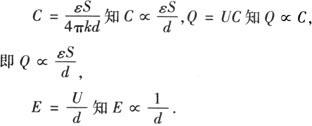 (2)平行板电容器充电后,若切断电源,则电容器极板上的电荷量Q不变,当电容器的结构d、S,ε发生变化时,将引起电容器的C,Q,E怎样变化? 这类问题可根据下列几式进行讨论:(只提供分析程序,结论不必记住)