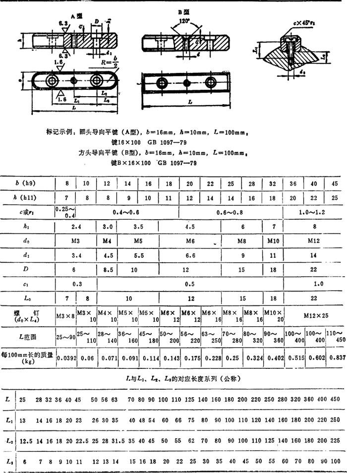 | 释义 | 平键及半圆键 平键、导向平键、半圆键和键槽的剖面尺寸以及键槽宽度b的公差分别见表4.5-1~4.5-4。 表4.5-1 平键和键槽的剖面尺寸(摘自GB1095—79、GB1096—79) mm