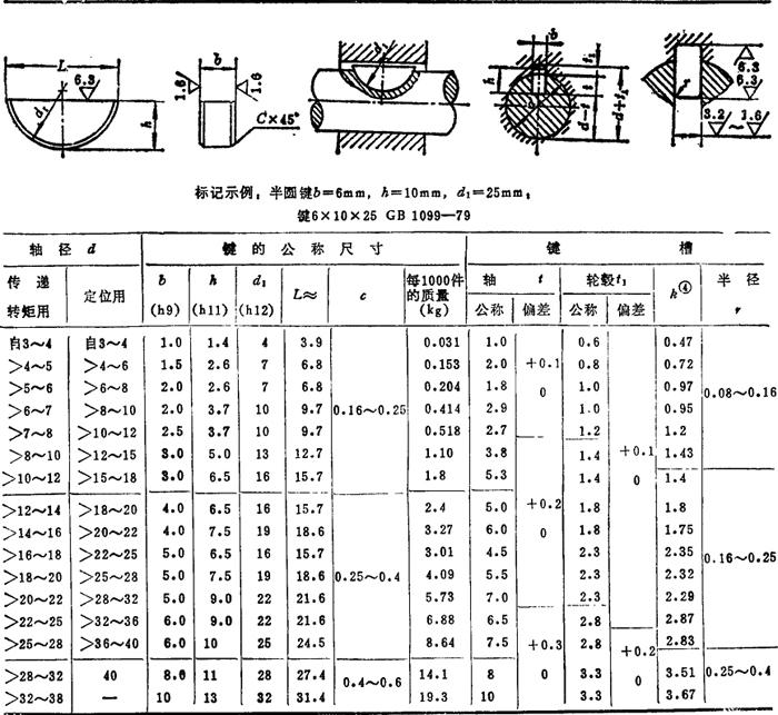 注:材料常采用抗拉强度不小于600MPa的钢,常用45钢。 表4.5-3 半圆键和键槽的剖面尺寸(摘自GB1098—79、GB1099—79) mm