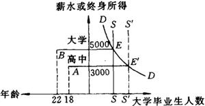 当其他因素相同时,一个人的收入或所得因年龄的增加而增加、因教育程度的提高而提高所形成的曲线。 在同年龄组中,如果一个人教育程度高,则其收入或所得亦高,形成因年龄和教育程度不同,所得的示意曲线不同,借以说明年龄和教育程度与个人收入和终身所得的关系。在市场经济国家,通过年龄所得曲线,可以反映和说明劳动力市场上大学毕业生的供给与需求是否存在过度现象。图示:  图中A、B两条线分别表示高中和大学毕业生预期终身所得。 在大学毕业生供需平衡情况下(E点),曲线显示所得亦高。如果大学毕业生过多,即供给增至S′,而需要不变,则收入下降至E′,曲线显示为较低的年龄所得曲线,即产生“大学文凭,高中薪金”的大才小用现象。这就要求调整供需矛盾,消除人才浪费现象。 |