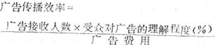 | 释义 | 广告传播效率 指广告信息传播阶段的广告费用投入与广告信息被接收和被理解程度的关系。 其计算公式为:
