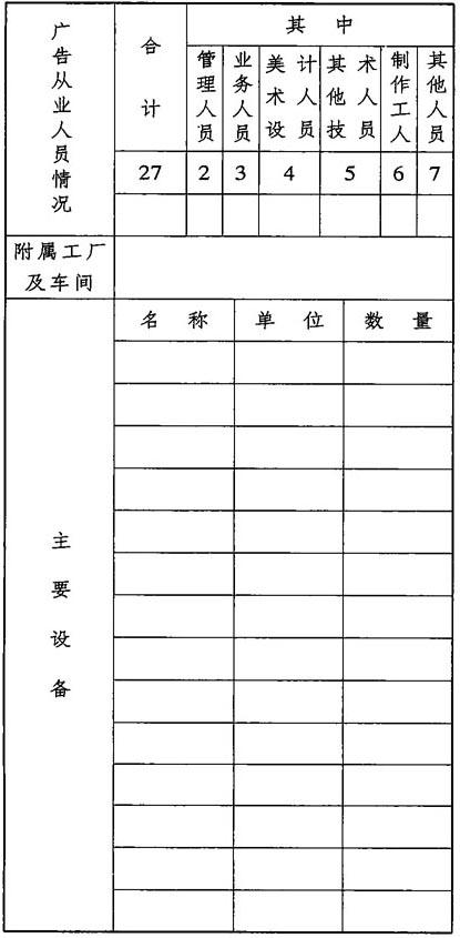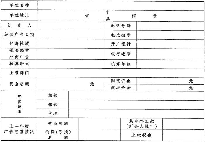 | 释义 | 广告经营单位申请登记文书 【简介】: 广告经营单位申请登记文书是指专营或兼营广告的企、事业单位和个体工商户,向工商行政管理机关申请办理开业注册手续的文书,专、兼营广告的企业,除应符合企业法人登记的条件外,还应具备经营广告的条件。广告经营单位登记申请文书的主件是国家工商局制定的《广告经营单位登记表》。 【范例】: 广告经营单位登记表 单位名称:________ 地 址:___________ 国家工商行政管理局制