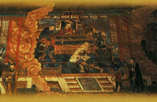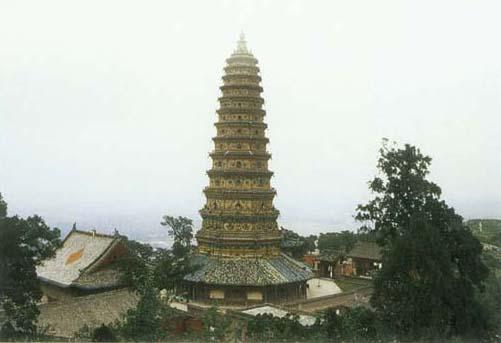 位于洪洞县城东北17公里处的霍山南麓,创建于东汉建和元年(公元147年),唐代扩建改名广胜寺,意即“广大于天,名胜于世”。元代毁于地震,现有殿堂为元代所建,明代正德、嘉靖年间(公元1515—1527年)在上寺增建琉璃飞虹塔。 广胜寺分为上寺、下寺和水神庙三部分。 上寺雄踞山顶,主要建筑有山门、飞虹塔、弥陀殿、大雄宝殿、观音殿,地藏殿、厢房、廊庑。虽经明代重建但形制结构仍是元代风格。山门内为塔院,飞虹塔矗立其中,塔平面呈八角形,塔身13层,高47米多。青砖砌成,各层均有出檐,用黄绿蓝三彩琉璃构件装饰,有人物、鸟兽、花卉等各种图案。各层檐角吊挂悬铃。在阳光照射下,辐射出道道彩虹,人称“飞虹塔”,是我国现存琉璃塔中时间最久而且罕见的作品之一。塔后是弥陀殿,又称前殿,前后开门,四壁无窗,殿内塑像姿态俊秀,是元代雕塑中的佳作。殿内还有一排红色的藏经木柜,驰名中外的金版藏经(俗称赵城藏经)原存于此。赵经内容浩瀚,篇幅长达七千余卷,字体刚劲,镌刻工整,纸质优良,印刷清晰,是罕世孤本,极有价值。 广胜下寺在山麓,随地势起伏而建,高低错落,层叠有致由山门、前殿、后殿,垛殿等元代建筑组成。山门即天王殿,身宽三间,进深六椽,单檐歇山顶,前后檐加出雨搭,形似重檐楼阁。前殿为弥陀殿,五间悬山式,殿内露明造,仅后槽明间设金柱两根,设计精巧,是为我国古建筑中减柱法之宝贵实例。后殿为大雄宝殿,七间单檐悬山顶,建于元至大二年(1309年),供元代泥塑三世佛、文殊、普贤像,衣褶披垂自然。殿内四壁原满绘壁画,1928年被盗卖国外,现藏于美国堪萨斯城纳尔逊艺术馆。现残存有山墙上部的善财童子五十三参图,画工精美,色泽富丽。南壁一幅“大行散乐忠都秀在此作场”壁画,是记载元代戏剧演出情况的珍贵资料。 水神庙与下寺毗邻,墙垣相连,由山门、仪门、明应王殿及两侧厢房窑洞组成。明应王殿为元延祐六年(1319年)重建宽深各五间,重檐歇山顶,周以回廊。殿内塑水神明应王及侍者像11尊,容貌、衣饰和塑造手法都为元代风格。殿内四壁布有壁画197平方米,内容为祈雨降雨图和历史故事。南壁东侧戏剧画中演员行当齐全,化妆、服装、道具、乐器、幕布、布景、舞台等一应俱备,生动反映了元杂剧的盛况,是我国元代壁画中的佳品。