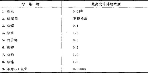废水排放标准 国家环境保护局1988-04-05发布,1989-01- 01实施的GB5978-88《污水综合排放标准》规定,将排放的污染物按其性质分为二类: 第一类污染物:指能在环境或动植物体内蓄积,对人体健康产生长远不良影响者,含有此类有害污染物质的污水,不分行业和污水排放方式,也不分受纳水体的功能类别,一律在车间或车间处理设施排出口取样,其最高允许排放浓度必须符合表2的规定。 表2 第一类污染物最高允许排放浓度(mg/L)