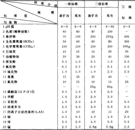 注 ❶ 烧碱行业(新建、扩建、改建企业)采用0.005mg/L。 ❷ 为试行标准,二级、三级标准区暂不考核。 第二类污染物:指其长远影响小于第一类的污染物质,在排污单位排出口取样,其最高允许排放浓度和部分行业最高允许排水定额必须符合表3和表4的规定。 表3 第二类污染物最高允许排放浓度(mg/L)