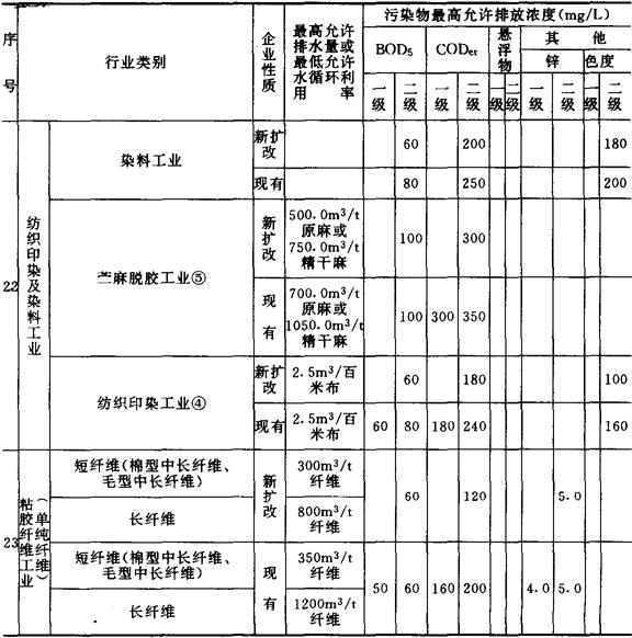 注 ❶ 最高允许排水定额不包括间接冷却水、厂区生活排水及厂内锅炉、电站排水。括弧内数字为最低允许水循环利用率。未列最高允许排水量的行业,应由行业或地方环境保护部门补充制订最高允许排水定额。 ❹ 制浆、苎麻脱胶工业排水色度暂不考核。 ❺ 印染污水排放定额不包括洗毛、煮茧和单一漂厂及用水量较大的灯芯绒等品种的生产厂。毛精纺染色排水CODcr、BOD5按表3标准值执行。 |