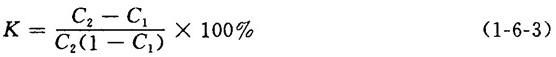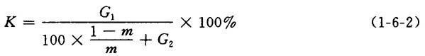 式中 K——提取率(%) G1——每吨绝干粗浆洗出液中固形物含量(kg) m——粗浆得率(%) G2——每吨绝干粗浆用药液量(kg) (三)近似计算法 【说明】 采用挤压法提取废液的工厂常以浓度法作近似计算。这样测定较快,计算较方便。 【公式】