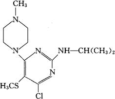 | 释义 | 异丙齐拉明 C13H22ClN5S=315.86 CAS-55477-19-5 4-氯-2-(异丙氨基)-6-(4-甲基-1-哌嗪基)-5-(甲硫嘧啶)。 4-Chloro-2-(isopropylamino)-6-(4-methyl-1-piperazinyl)-5-(methylthiopyrimidine). 4-氯-N-(1-甲基乙基氨基)-6-(4-甲基-1-哌嗪基)-5-(甲硫)-2-嘧啶胺。 4-Chloro-N-(1-methylethylamino)-6-(4-methyl-1-piperazinyl)-5-(methy1thio)-2-pyrimidinamine. 镇静药,镇吐药。 异丙哌嘧啶。 Iprozilamine. INN,USAN.