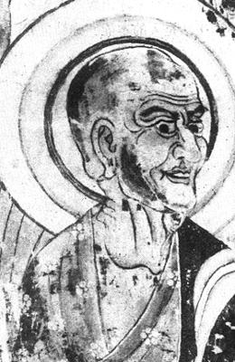 【作品赏析】: 释迦的十大弟子(舍利弗、目犍连、阿那律、须菩提、富楼那、迦旃延、优婆离、罗喉罗、阿难),他们有的出身婆罗门大富之家,有的来自六师外道,有的是释迦出家前的王宫近臣和他的堂弟、亲生儿子,年龄长幼不一,随从释迦出家学道,各人均有一套超群的本事,分别侍佛左右。 莫高窟壁画中的弟子像,在北周之前都画在佛说法图中,只画左右各一身,均为小沙弥形象。北周始有弟子塑像,且能塑造出民族、年龄和性格的差异,突出表现了长者迦叶、青年阿难的不同形象;同时在龛内绘制弟子像,有多至八身十身的。唐代,弟子画像得到空前的发展,龛内画像有汉僧、胡僧,年龄性格在各窟中表现的均不相同,即使同壁也有区别,任凭画师所创,并非依经文绘制。此像绘于217窟龛内释迦塑像之左侧,按其位置当是第二位弟子目犍连。 他出家前是“六师外道”之人,后随释迦出家,学就“神通第一”,能“神足轻举飞到十方”。但画像却是一位老成持重、双目圆睁、启齿微笑的长者。画像充分表现了以线造型的中国画特点。用笔极为简练,主要抓住胡僧头部结构的描绘,以及高鼻、大眼、微笑著的嘴唇的个性特征,这些都在画笔的轻重起落、疾徐顿挫运动中塑造如生。 特别是对眼睛的夸张,更显容光焕发、炯炯有神。。  盛唐 壁画 敦煌莫高窟 217窟 纵61厘米 横38厘米 |