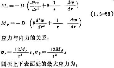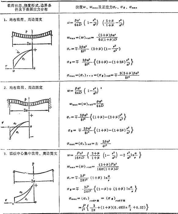 表3.1-30给出圆形薄板在各种轴对称载荷和边界条件下的挠度、板的上下表面弯曲正应力表达式及其分布规律和最大挠度和最大弯曲正应力公式。 表1.3-30 圆形薄板的强度和刚度计算公式