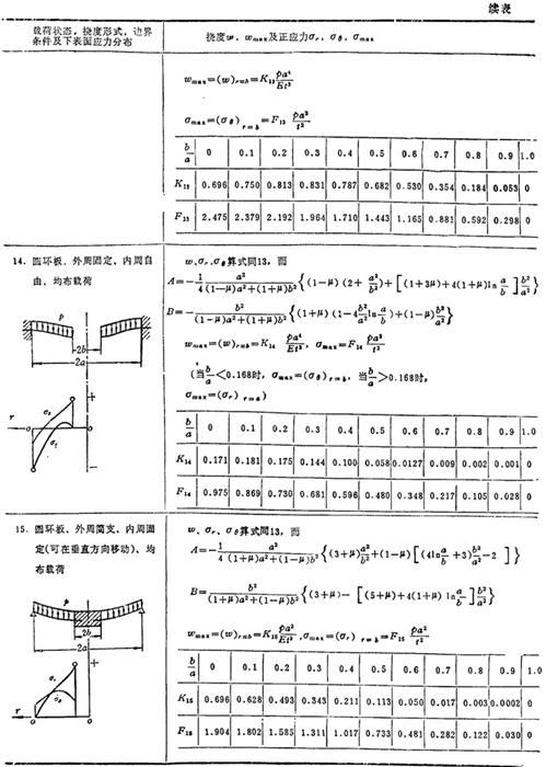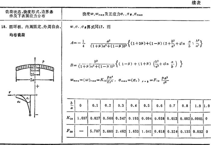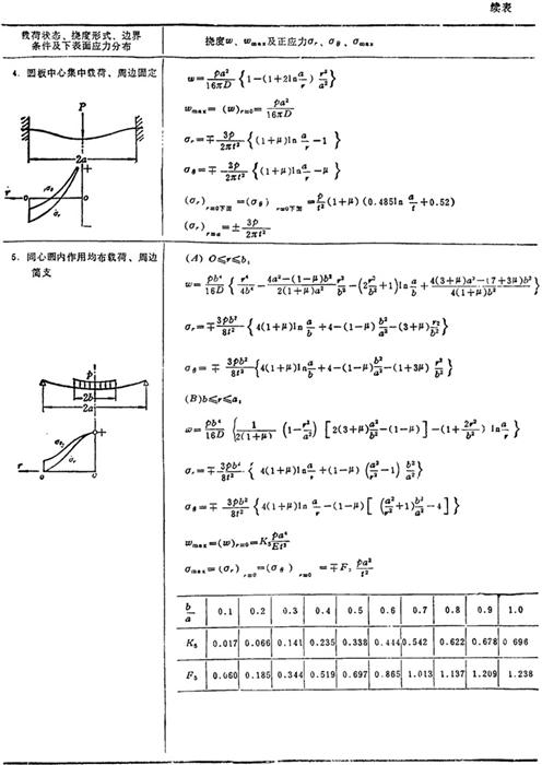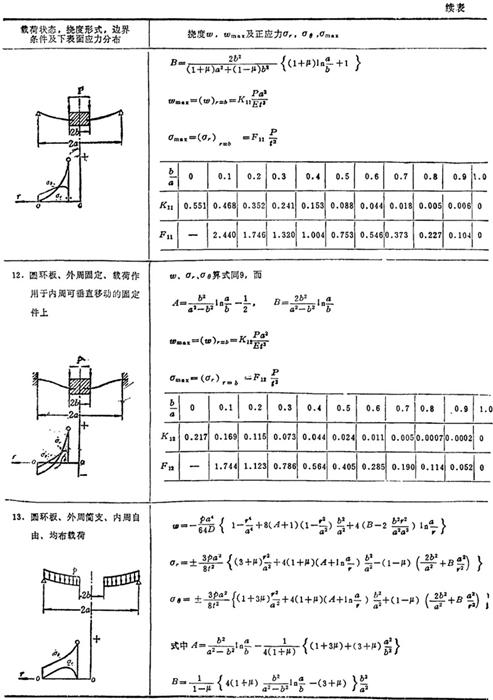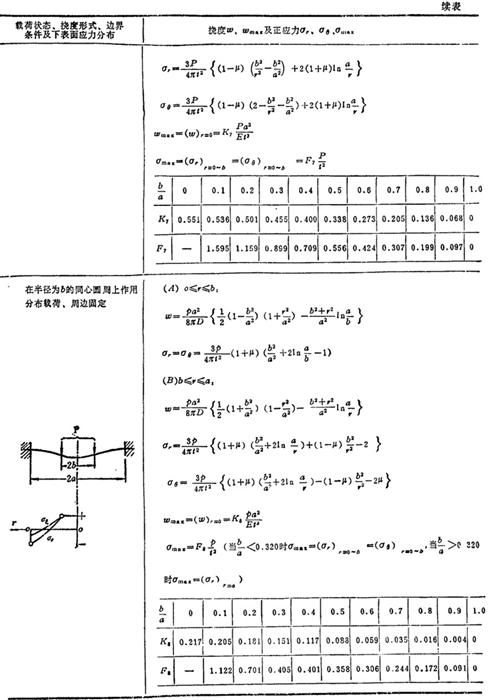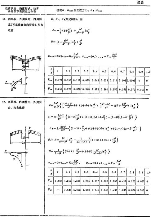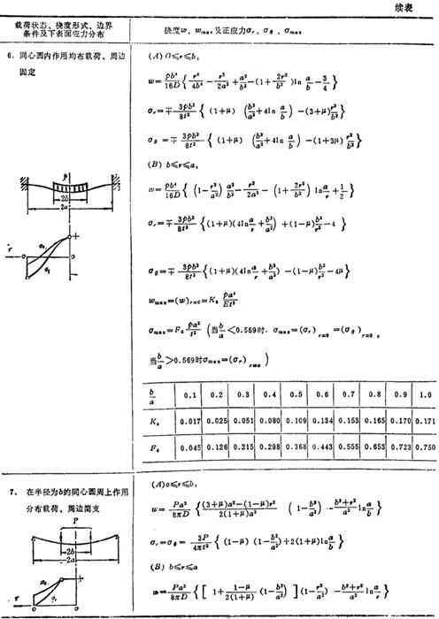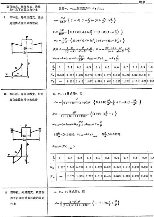 说明:p为单位面积载荷,p为集中载荷或同心圆上或周边上作用载荷的总和,t为板厚,E为弹性模量,μ为泊松比,ωmax为最大挠度,σmax为最大弯曲正应力,a和b分别是圆板的外半径和内半径,在应力公式中 |