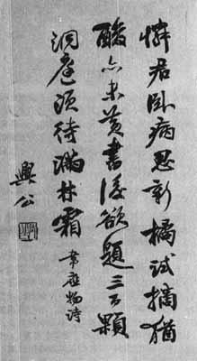| 释义 | 录韦应物诗轴 【简介】: 现代·余中英书。纸本。行书。七言绝句一首。凡四行,共三十字。刊于《民国时期书法》(上)。 【赏析】: 此幅书唐诗人韦应物的诗,韦诗虽写得淸新而萧散,风趣而有韵味,余中英的字却骨力遒健、姿态丰腴。其书融滙宋代苏轼、米芾诸人的风格,并在此基础上自铸新意。笔势虽未及米书之沉著痛快,飘逸风流,却也不乏洒脱之气;天趣浑然与雍容敦厚未及东坡,但也有苏之丰腴流美之韵。徐浩论书曰:“夫鹰隼乏彩,而翰飞戾天,骨劲而气猛也;翚翟备色,而翺翔百步,肉丰而力沉也,若藻耀而高翔,书之凤凰矣。”余中英之书虽未达到“书之凤凰”的境界,然也不失爲力度与丰姿相结合的作品。但有的字运笔不够纯熟,总体上看来,第一行不如第二行,第二行不如第三行。