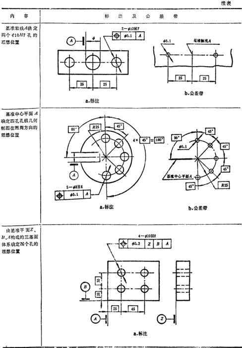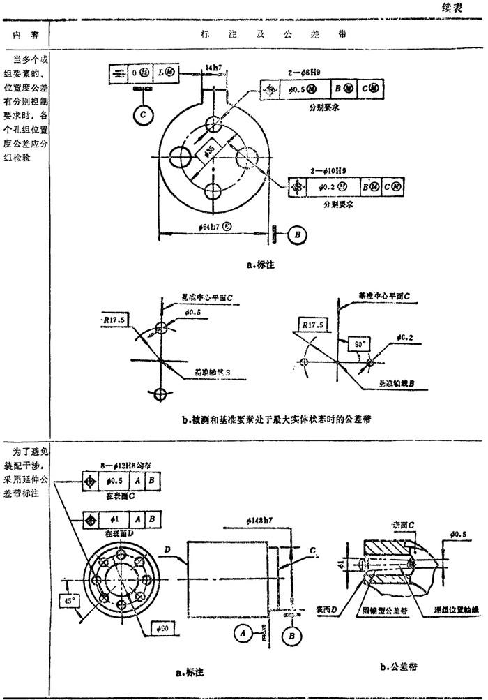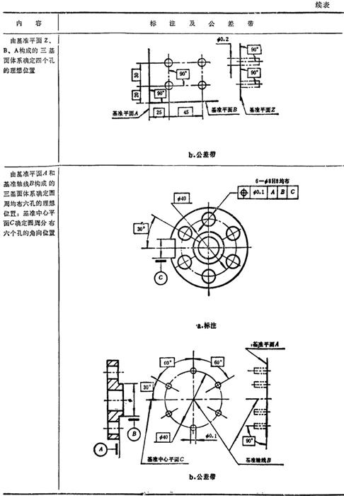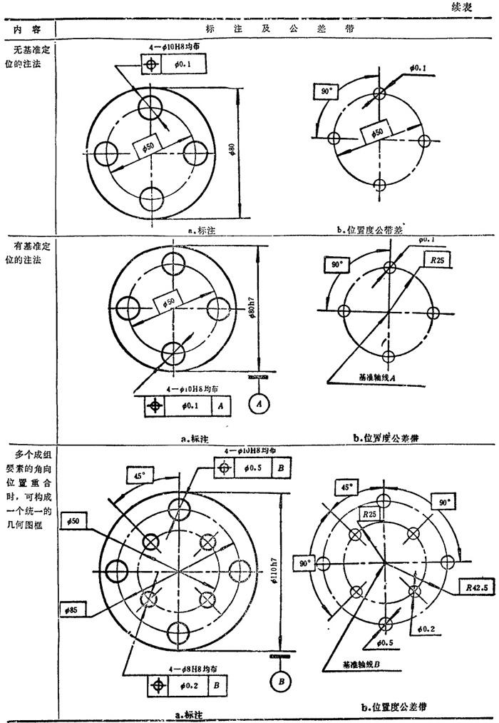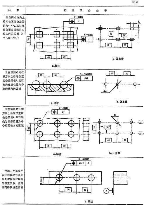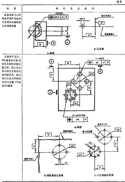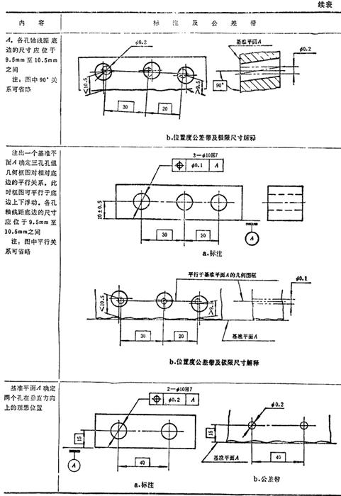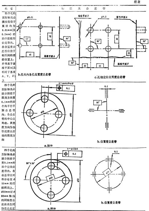 GB/T1182-1996规定,形位公差在技术图样中采用框格代号标注,在某些特殊情况下无法采用框格代号标注时,允许用文字说明。GB1331g-91又对位置度公差的标注方法及公差带做了补充说明。具体标注方法见表1.7-14~1.7-18。