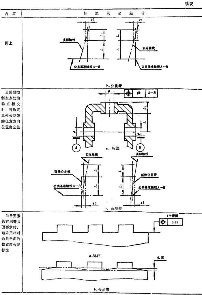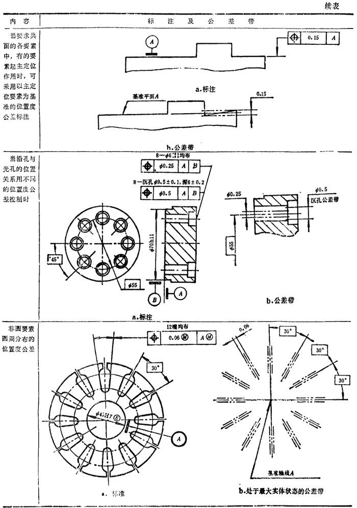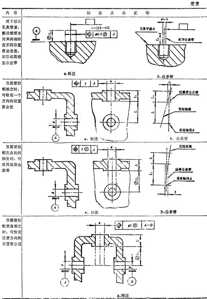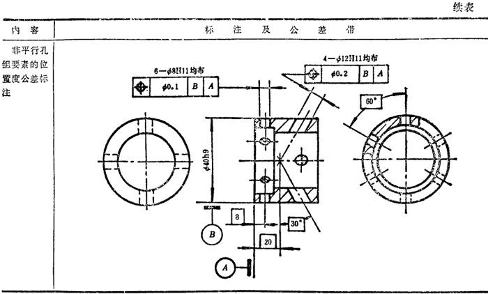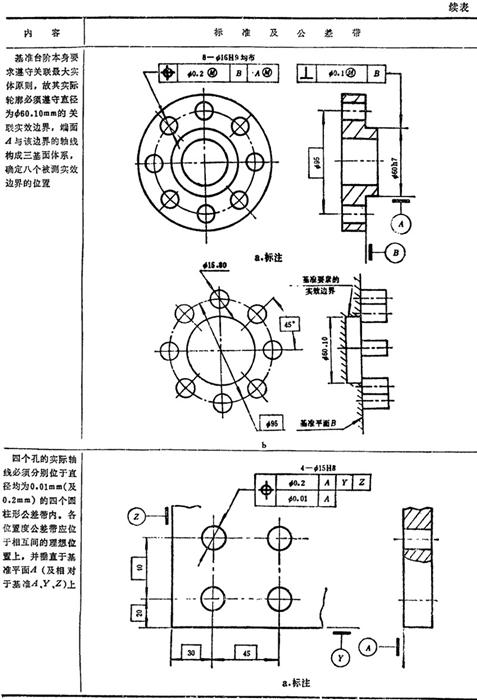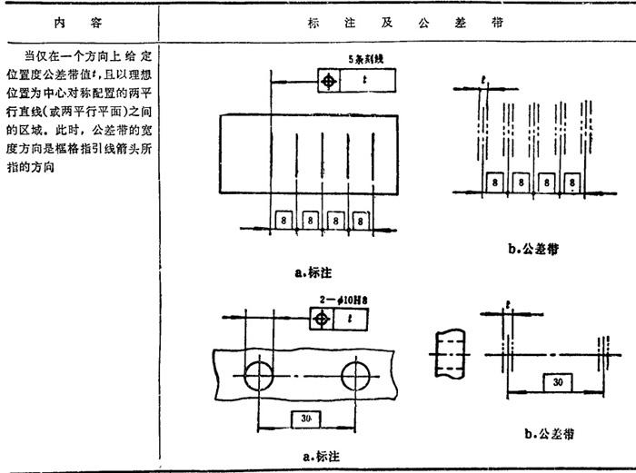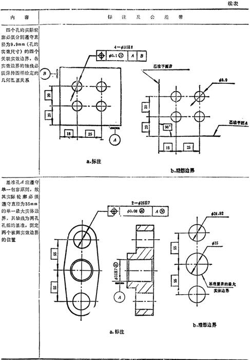 GB/T1182-1996规定,形位公差在技术图样中采用框格代号标注,在某些特殊情况下无法采用框格代号标注时,允许用文字说明。GB1331g-91又对位置度公差的标注方法及公差带做了补充说明。具体标注方法见表1.7-14~1.7-18。