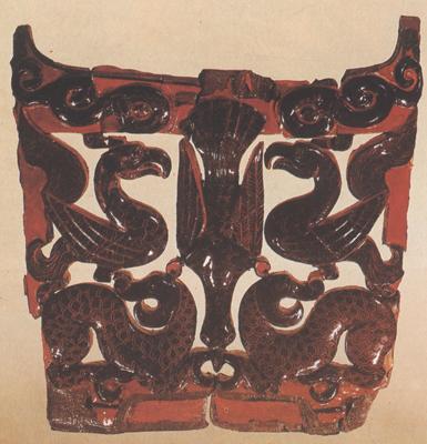◎盛箭器/战国中期 1965年湖北江陵沙冢遗址1号楚墓出土 长22.6厘米 上宽19厘米 下宽18厘米 木胎/湖北省博物馆藏 ●此箭箙(音服)微残,木雕保存基本完整。 箭箙饰件采用透雕为主、浮雕为辅的工艺制成。箭箙饰件以俯冲的单雀为中心,蠕动的双蛇、展翅的双凤和匍伏的双兽左右对称;自上而下,蛇头、凤头和兽头成一条直线。整个箭箙构图突出凤鸟的中心地位,凤鸟用利爪将兽头紧紧抓住,似乎在为胜利引颈高歌;怪兽身躯拱起,四足抓地,尾巴上翘,回首张望,慑于凤鸟神威而惊恐万分;双蛇各自龟缩一隅,原地盘旋蠕动。 楚人崇拜凤鸟,于此箭箙略见一斑。 该箭箙通体以黑漆为地,外框于黑地上满髹朱漆,饰件上则用朱漆彩绘纹样。雀和凤的羽毛为弦线纹、斜线纹和鱼鳞纹,兽身和蛇身饰以鱼鳞纹。此箭箙构图明快,形象生动,色彩对比强烈而艳丽。 |