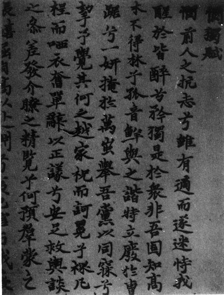 【简介】: 明·杨基书。纸本。楷书。凡十六行,共二百二十五字。28.4×40.8cm。台北故宫博物院藏。刊于台湾《故宫历代法书全集》(三)。 【赏析】: 《悯独赋》墨迹,萧散舒放,不拘一格,虽劲挺,不乏妍美之态。笔画畅爽,用笔以侧入爲主,骨法突出,然部分字伤于婉弱,笔画过于平滑。字形或收或放,收者字势内敛,奇险。如“前”、“踞”、“得”、“参差”诸字。放者主画纵笔,如“醉”、“衆”、“举”等。细察个别字形失于严谨。如“矜”左右位置错开,“是”上下位置移动过大。“解”比例失调,“精”失于稳正。通篇布局紧凑弥满,浑如一体,于笔于形,有所补益。  |