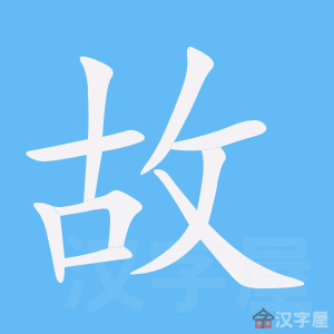 字源解说 故,金文 = (古,作古,即老朽而自然死亡)+ (攴,持械攻击),表示击杀老人。造字造字本义:人为结束老人垂死而痛苦的生命。篆文 承续金文字形。隶书 将篆文的“攴” 写成“夂” 。 附 文言版《説文解字》:故,使爲之也。从攴古聲。 附 白话版《说文解字》:故,有意使它变成这样。字形采用“攴”作边旁,“古”作声旁。 引申线索