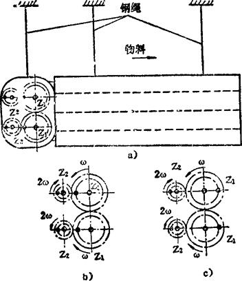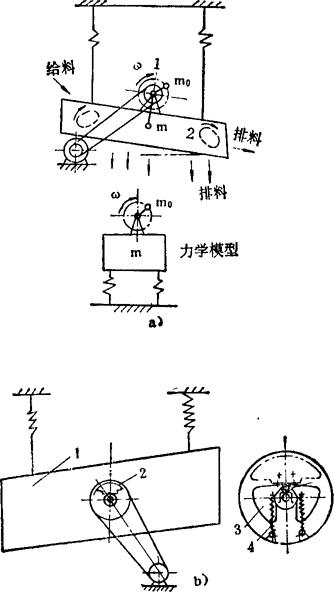 图a)所示是单轴惯性振动筛。当电机转动时,通过三角胶带使在筛体质心m上方的单轴激振器1转动,使筛体2按椭圆形轨迹振动(图中虚线轨迹)。由于激振器在质心的上方,所以在给料端的椭圆形轨迹向右倾斜,而排料端的轨迹向左倾斜。这样,促使给料端物料沿筛面运动速度加快,而排料端物料运动速度减慢。如果激振器1位于筛体质心m的下方,则筛体的椭圆形轨迹的倾斜方向与物料沿筛面的运动速度均与上述情况相反;如果激振器1放在筛体质心上,筛体运动轨迹为圆形,整个筛体运动速度相等。 图b)为采用自动消矩激振器的振动筛。图中1为振动筛筛箱,2是自动消矩激振器,可实现在开停车通过共振点时,激振器的激振力等于零,使系统振幅不致过度增大。右图为自动消矩激振器的放大图,开车后转数达到一定值时(已过共振点),偏心块3的离心力大于弹簧4的拉力,偏心块绕轴心旋转到图中双点划线位置,并产生激振力。停车时,转数减慢,在弹簧作用下,偏心块被拉回原位,不产生激振力,再越过共振点。 例5.2-244 双轴式振动机构