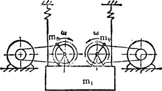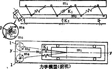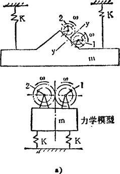 如图示,回转轴上有偏心质量m0的激振电机,安装在设备的两侧,按照自同步原理,在正常工作情况下只产生y方向的激振力。这种双质体自同步近共振点振动输送机也有非线性型式。 例5.2-250 双轴平行式振动垂直输送机