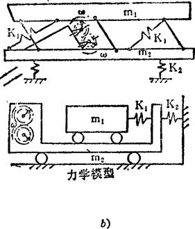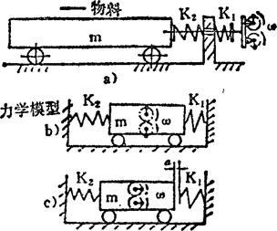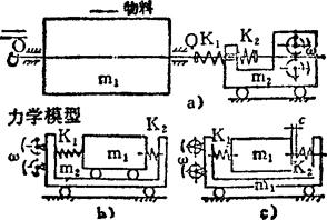 如图a)所示,在振动质体m前后两个振动方向装有刚性分别为K1、K2的两弹簧。刚性大的弹簧K1在每个周期内时而被压缩、时而伸开,接触时如图b)所示,伸开时如图c)所示。由于非线性振动导致的差动运动,从而使物料向前移动,并产生适当的冲击加速度,以实现筛选。此设备在近共振区工作,其惯性力大部分传给基础。 例5.2-247 双质体近共振非线性振动离心摇床