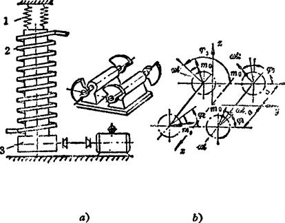 图a)为该输送机的简图,主要由悬挂弹簧1、螺旋输送槽2和激振器3组成。为了使散状物料沿螺旋槽上升,不仅需要有垂直方向的激振力,还必须有与激振力同频率、同相位绕铅垂轴的激振力偶。而双轴平行式惯性激振器则可实现这一目的。图b)为双轴平行式惯性激振器简图。图中各偏心质量均为m0,偏心距均为e,初相角分别为φ1、φ2、φ3和φ4,两轴同步反向回转,角速度为ωf,为使惯性力沿铅垂轴和惯性力偶绕铅垂轴,必须满足:φ3=π-φ1;φ4=π-φ2。若使φ1和φ2满足