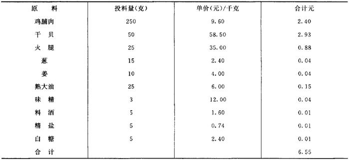 采用盘存计耗法,必须切实做好盘存工作,及时全面准确地清查剩余原材料及半成品,并合理地做好折价计算工作 (2)标准成本法 标准成本法亦称配料定额成本法,即以每一单位餐饮制品所耗用主料、副料和调料的标准数量的货币表现作为计算成本基础的一种方法,各项原料成本之和即为每一单位餐饮制品的会计成本。公式如下: 单位产品成本=主料成本+配料成本+调料成本 干贝扒鸡的标准成本如下表所示: 干贝扒鸡标准成本