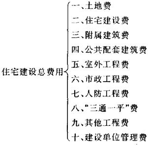 例如:建9,000m2新房,安置用6,000m2新房,建安比即为1∶0.67。一般情况下,这个比值<1,在旧区改建,居民人口密度特别高的地区也有的比值>1。 (2)住宅建设的劳动消耗量——总费用分析 住宅建设总费用的项目构成,如图。