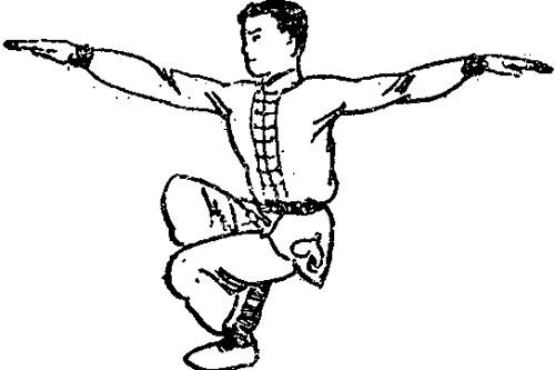 支撑腿屈膝半蹲。另一腿屈膝,脚尖勾起并紧扣于支撑腿的膝后。