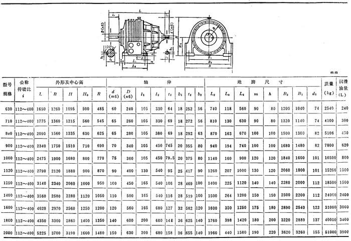 减速器的传动比见表6.4-1,承载能力分别见表6.4-2~6.4-6,外形及安装尺寸见表6.4-7~6.4-12。