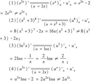 | 释义 | 指数函数的导数 (ex)′=ex,(ax)′=axlna. 例1 下列函数求导数,正确的个数是( ). (1)(e2x)′=e2x; (2)[(x2+3)8]′=8(x2+3)·2x; (3) (4)(a2x)′=2a2x. A.0 B.1 C.2 D.3 解 根据复合函数的求导法则,导数的四则运算法则、基本函数的导数公式,逐个计算所给四个函数的导数.
