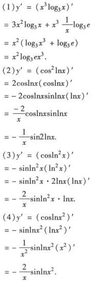 ∴选A. 例2 求下列函数的导数. (1)y=x3log3x;(2)y=cos2lnx; (3)y=cosln2x;(4)y=coslnx2. 解 以上各题是求关于初等函数的混合导数,不仅用到对数函数,指数函数的求导法则,还需注意复合函数的求导法则,如将y=coslnx2分解为y=cosu,u=lnv,v=x2利用复合函数的求导法则求导即可.