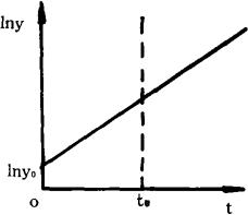图中纵坐标y表示技术发展或经济增长的某些可以计量的功能特性参数,如速度、产量、产值等,横坐标t表示时间,t0表示现在时间,t0以前表示过去时间,t0以且表示未来时间。如果把图中纵坐标变换为对数坐标,而横坐标保持不变,则得到半对数坐标的指数增长曲线,如下图: