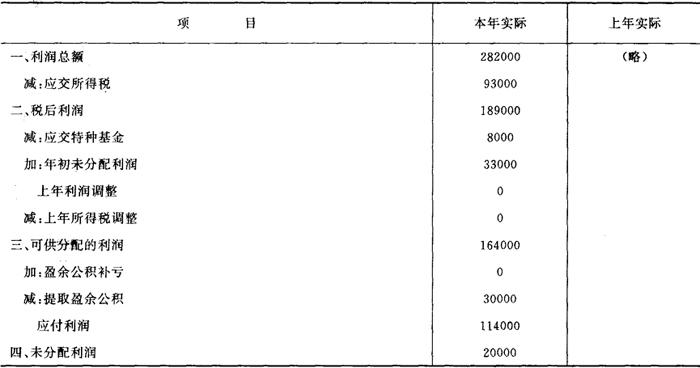 | 释义 | 损益表附表的编制方法 1.利润分配表的编制 利润分配表是反映企业利润分配的情况及未分配利润数额的报表,是损益表的重要附表。该表分为以下四个部分:利润总额、税后利润、可供分配的利润及未分配利润。表中“本年实际栏,根据当年“本年利润”及“利润分配”帐户及其所属明细帐户的记录分析填列。“上年实际”栏根据上年“利润分配表”填列。以下分别说明表中各项目的具体内容及填列方法。 (1)“利润总额”项目,反映企业全年实现的利润,如为了亏损,则以“-”号在本项目内填列。本项目可根据“本年利润”帐户年底结转到“利润分配”帐户的合计数填列。该项数额应与损益表中当年的利润总额相等。 (2)“应交所得税、项目反映企业应交纳的所得税数额。本项目应根据“利润分配——应交所得税”明细帐户借方全年发生额合计数填列。 (3)税后利润”项目是“利润总额”减去“应交所得税”后的差额。 (4)“应交特种基金”项目,反映非国有企业按规定应上交财政的能源交通重点建设基金和预算调节基金。本项目应根据“利润分配——应交特种基金”明细帐户的数额填列。 (5)“年初未分配利润”项目,反映企业上年年末未分配的利润,如为未弥补的亏损,则以“-”号表示。本项目应根据“利润分配——未分配利润”明细帐户的年初余额填列。本项目的数字应与上年利润分配表中“本年实际”栏“未分配利润”项目的数额相等。 (6)“上年利润调整”项目,反映因某种原因需要对上处利润和利润分配进行调整的数额。调增时,登记在“利润分配——未分配利润”明细帐户的贷方,调减时应作相反分录。本项目中利润调增以正数表示,调减则以“-”号表示。 (7)“上年所得税调整”项目,反映因调整增加利润或减少利润而增加或减少的应交纳的所得税。因调整增加利润而增加的所得税以正数表示,调减利润而冲抵的所得税以“一”号表示。 (8)“可供分配的利润”项目,反映税后利润经以上四项调整后,当年可供分配的利润数额。 (9)“盈余公积补亏”项目,反映企业用盈余公积弥补的亏损数额。本项目根据“利润分配——盈余公积补亏”明细帐户的全年累计的弥补亏损额填列。 (10)“提取盈余公积”项目,反映企业提取的盈余公积金。本项目根据“利润分配——提取盈余公积”明细帐户全年累计提取盈余公积数额填列。 (11)“应付利润”项目,反映企业应付给投资者或其他单位和个人的利润。本项目根据“利润分配——应付利润”明细帐户全年累计应支付的利润数额填列。 (12)“未分配利润”项目,可供分配的税后利润经上述分配后,为年末企业未分配利润。该项数额应与“利润分配”帐户结帐后的年终余额相一致。下面是“利润分配”总帐帐户及其明细帐户的本期发生额和余额与利润分配表。 利润分配帐户全年累计发生额及余额 单位:元 编制单位:X公司 19×4年 会工02表附表1 单位:元